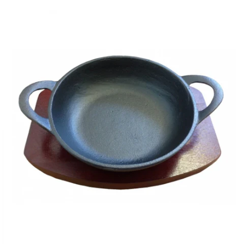 CAST IRON BALTI DISH COMES WITH WOOD BASE.