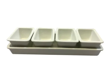 CRESCENT CERAMIC RELISH SET OF 4 POTS AND A TRAY 13″ X 5″ HE2408-W
